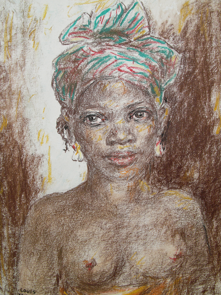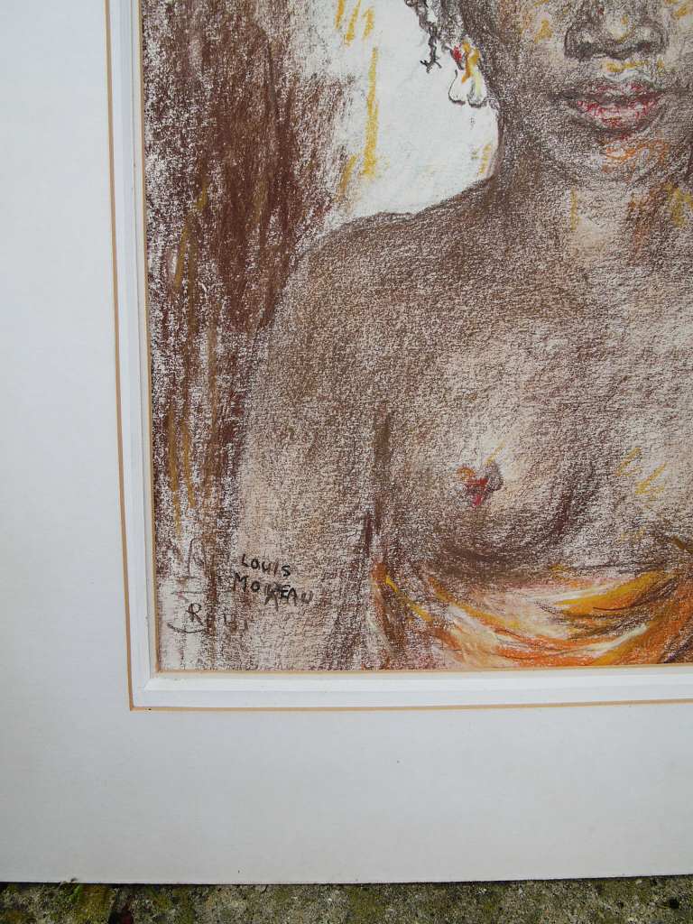 Een crayon (houtskool op papier) dat gedeeltelijk is gekleurd. Afgebeeld is een Afrikaans meisje met ontbloot bovenlichaam en mooi gedrapeerd hoofddeksel. Achterop het crayon is vermoedelijk het toenmalige adres van Louis Moreau en de gegevens van de kunsthandel te Piccadilly Circus in Londen, waar het werk is verkocht. Het werk is goed beschermd achter glas en is daardoor in zeer goede conditie.