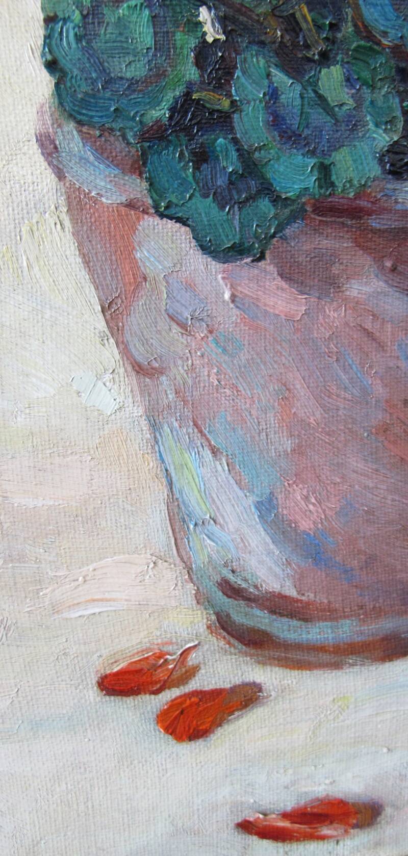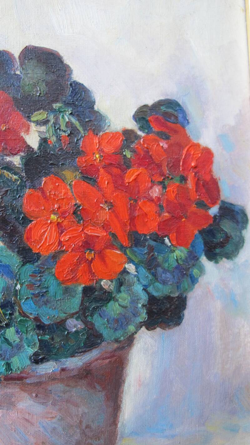 Een mooi stilleven van een stenen vaas met rode geraniums. Een aantal bladeren zijn al afgevallen en liggen op tafel. Impressionistisch en toch met veel liefde voor details geschilderd. Dit olieverf schilderij op doek is voorzien van een strakke, mooie lijst en het geheel verkeert in zeer goede staat.